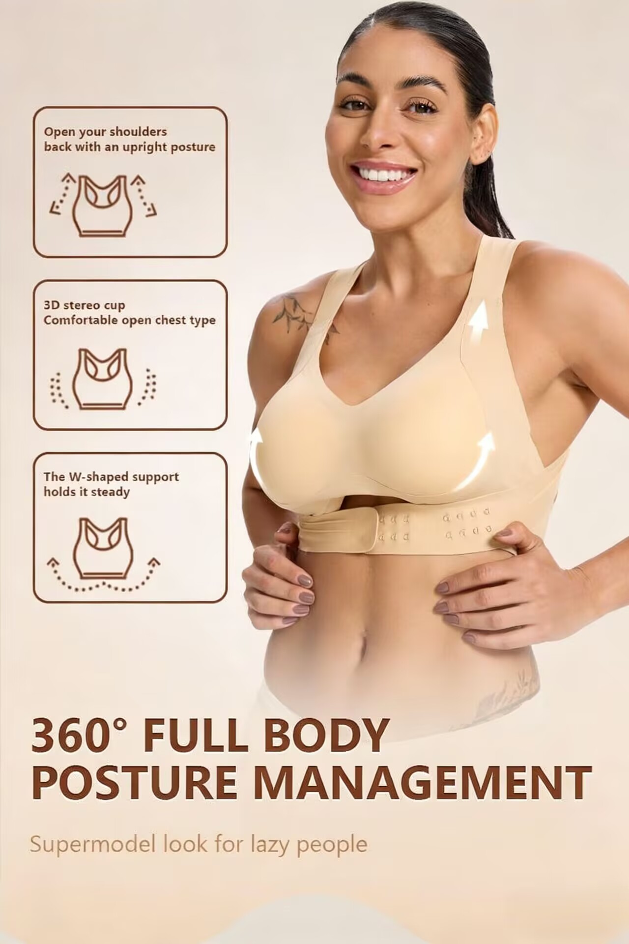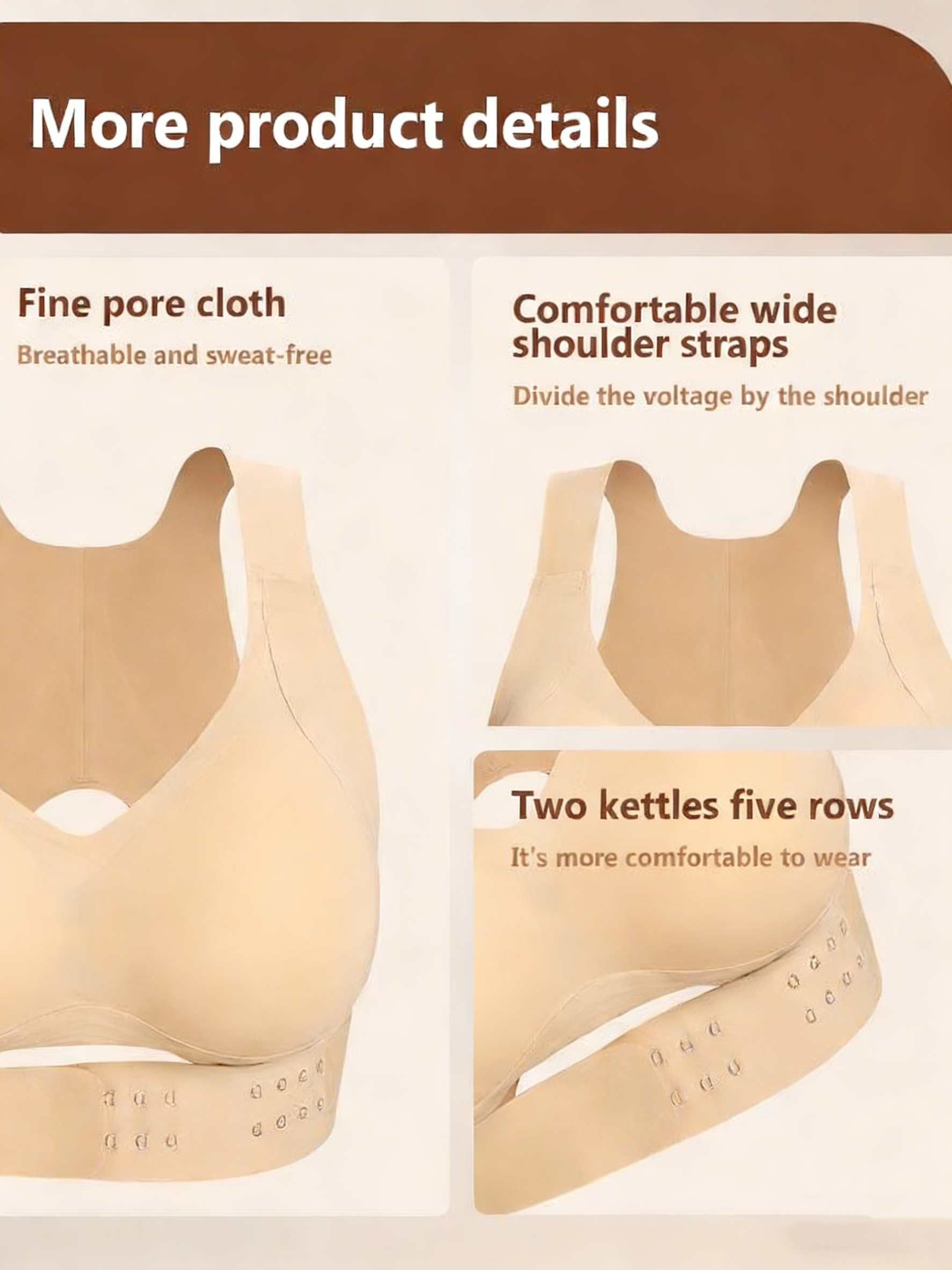 This posture-correcting, seamless bra is designed with ergonomics in mind. Its back support structure gently opens up the shoulders and back, effectively improving posture and reducing slouching and hunching. The wide straps evenly distribute pressure, reducing strain on the shoulders and neck; the lifting structure supports the bust, preventing sagging; the gathering cups naturally shape and lift the breasts; and the soft, seamless fabric is comfortable against the skin, ensuring comfort even with prolonged wear.